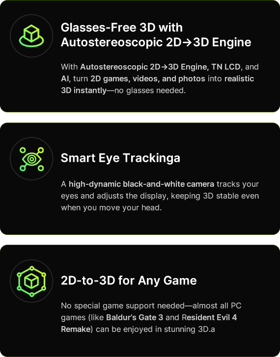 With AstraDepth3D and AI technology, it instantly turns any 2D game, video, or image into stunning 3D. Smart eye-tracking ensures the visuals follow your every move—turn your head, and the immersive magic stays perfectly in place.